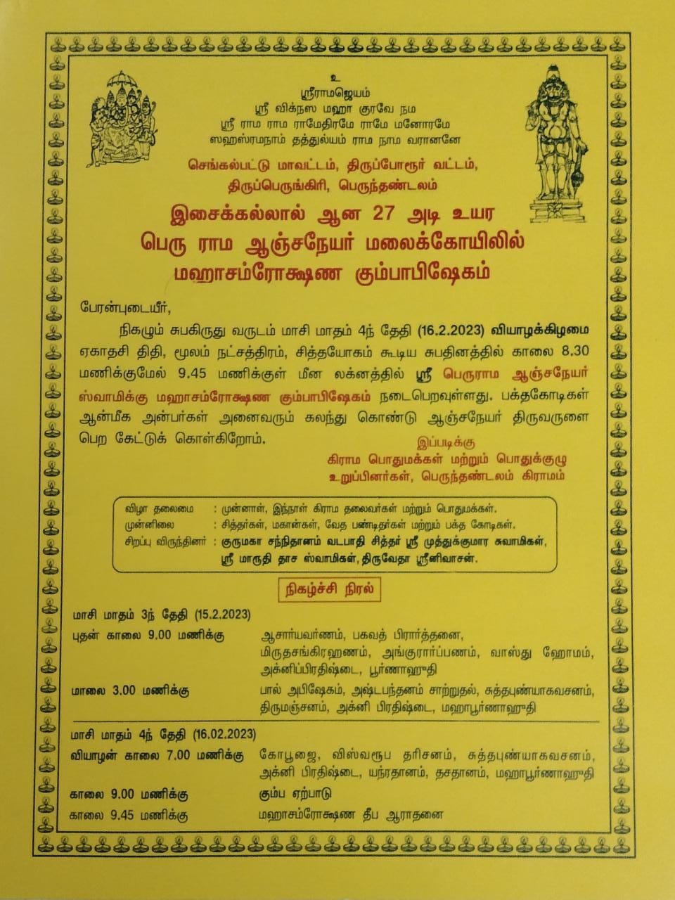 Sambrokshanam, also known as Kumbabhisheka, is a sacred and important ceremony that is performed in the Hindu religion. It is a rite of purification and consecration of a temple or a holy structure. We are excited to invite you to the Sambrokshanam celebration of our beloved Peru Rama Anjaneyar, which is scheduled to take place on February 15th and 16th, 2023.
